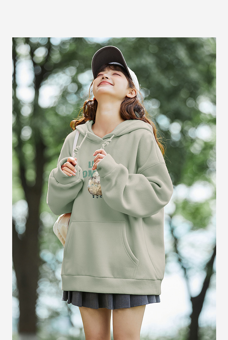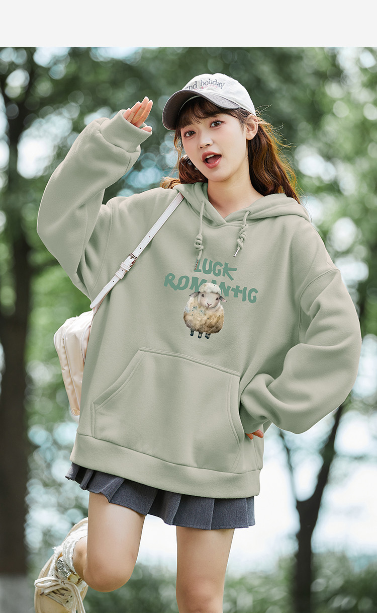 2024冬季女连帽前胸小羊图案加绒卫衣减龄学院风百搭韩版休闲
