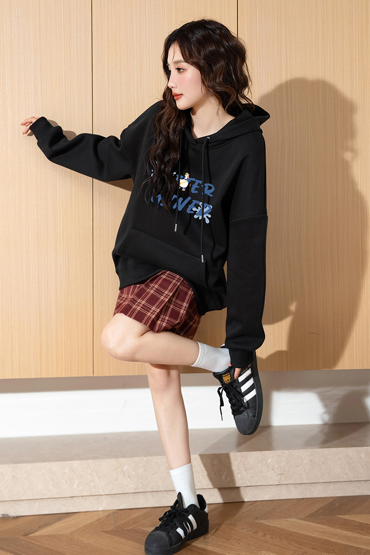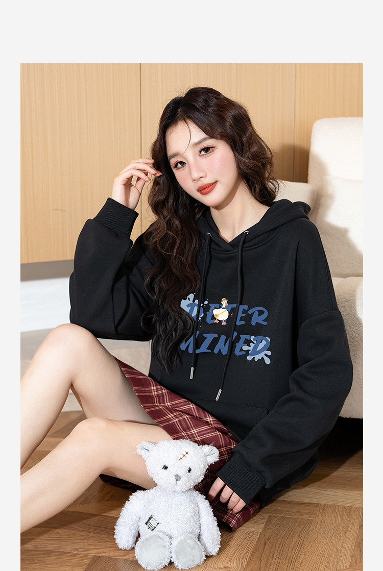 2024秋冬女连帽前胸字母加绒卫衣宽松时尚百搭显瘦舒适上衣