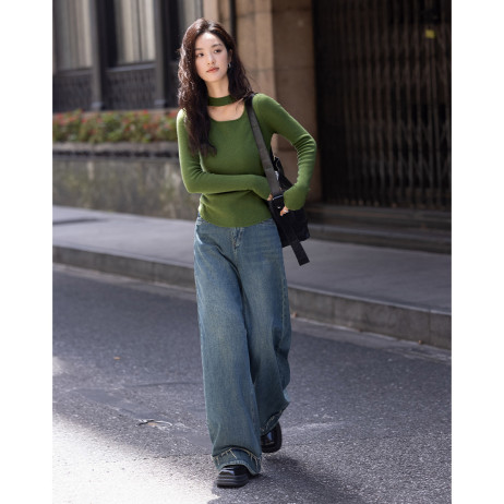 【草绿镂空领针织衫】2024冬圆领挂脖镂空设计修身长袖针织衫