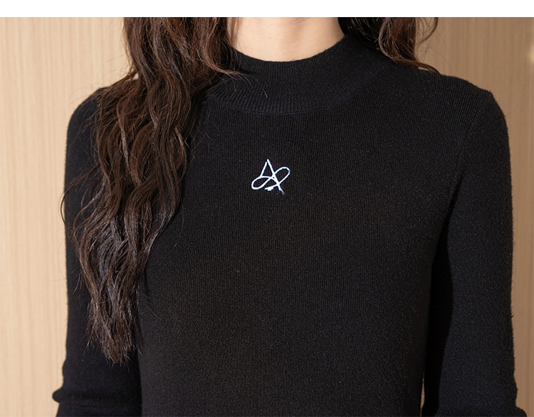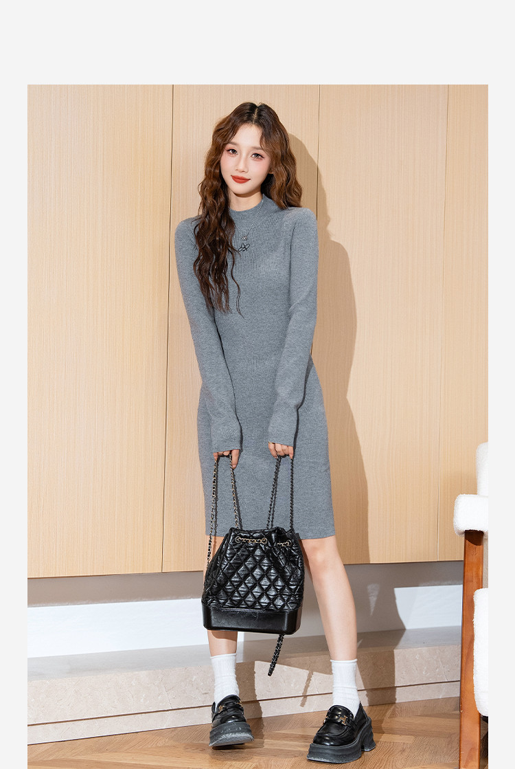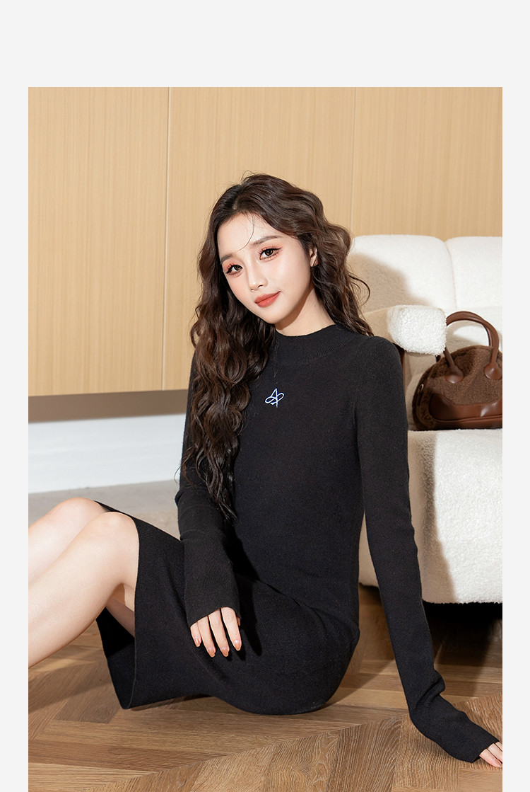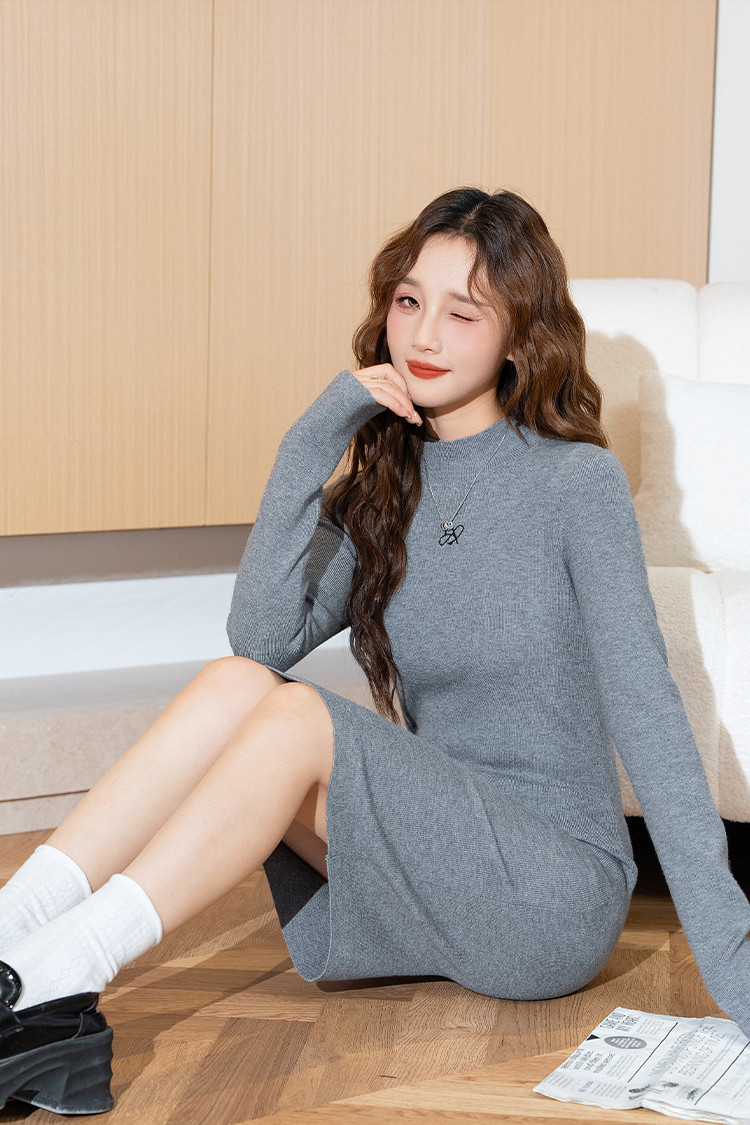 2024冬季女圆领收腰净色长袖毛织连衣裙简约显瘦百搭韩版休闲