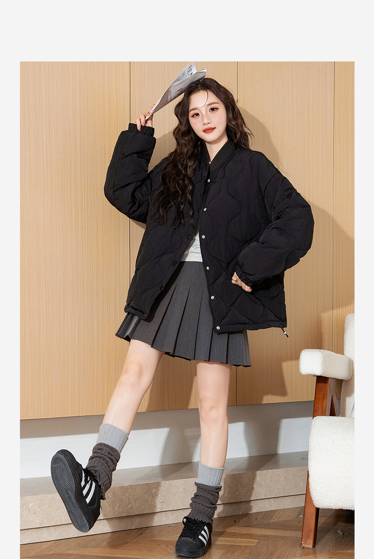 2024冬季女无领净色菱形格短款羽绒服百搭温柔简约通勤温柔潮