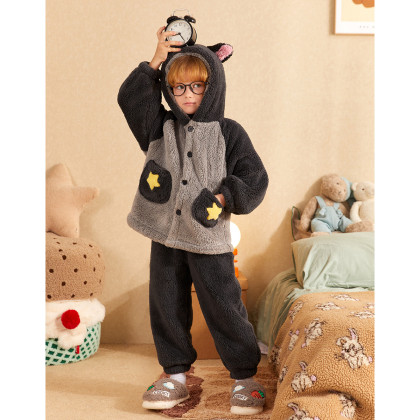 【立体耳朵连帽】男童睡衣秋冬加厚北极绒家居服套装可外穿