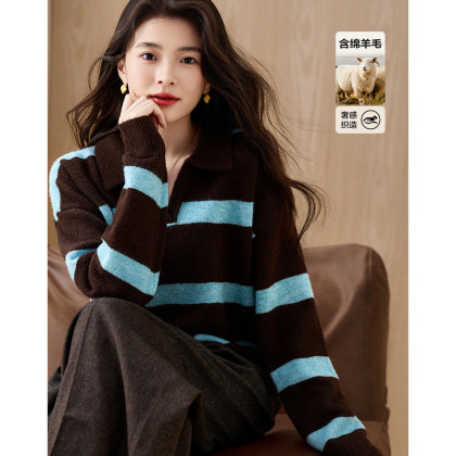 【海盐可露丽】冬季复古风撞色条纹翻领线衫含绵羊毛针织衫女上衣