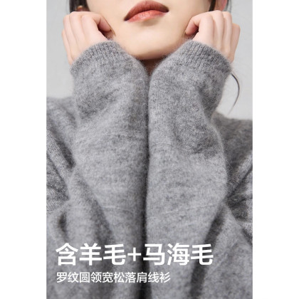 【绵羊毛马海毛混纺】冬季罗纹圆领宽松落肩线衫柔弹针织衫女上衣