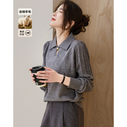 【含绵羊毛】冬季静奢风钉扣翻领泡泡袖线衫包容身材针织衫女上衣