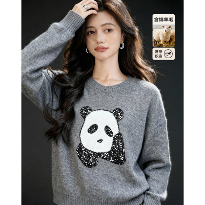 【含绵羊毛】冬季萌趣撞色动物提花线衫圆领罗纹宽松针织衫女上衣