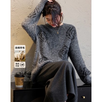 【含蓬松绵羊毛】秋季亮片玫瑰花线衫圆领落肩宽松气质针织衫上衣