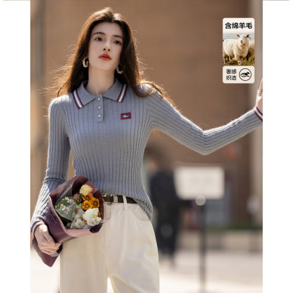 【含蓬松绵羊毛】秋季智感翻领撞色字母绣花线衫修身针织衫女上衣