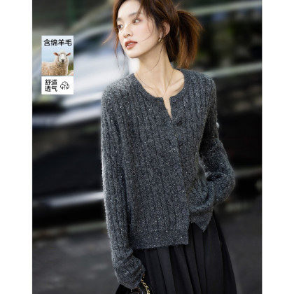 【含蓬松绵羊毛】秋季圆领绞花亮片线衫宽松藏肉小个子针织衫上衣