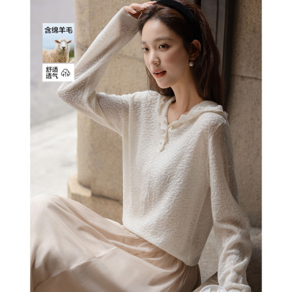 【含温润绵羊毛】秋季浮雕肌理蕾丝连帽线衫罗纹收口针织衫女上衣