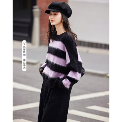 【时尚慵懒风】冬季圆领堆堆袖拉绒条纹气质拼色针织衫女上衣
