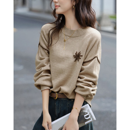 【美拉德风线衫】春秋复古撞色绣花圆领长袖宽松遮肉针织衫女上衣