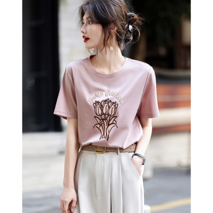 【巴黎假日】夏新圆领郁金香印花短袖t恤女棉氨清爽无压女式t恤