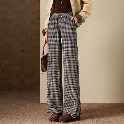【温暖加绒系列】冬季慵懒风松紧腰系带格纹直筒小个子女式休闲裤