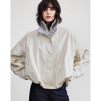 【醇柔全棉磨毛】秋季都市简约双层翻领拼色格纹翻折宽松女式外套