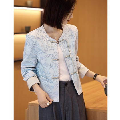 【清冷白茶】秋国风新中式圆领提花对襟流苏扣藏肉外套女短款
