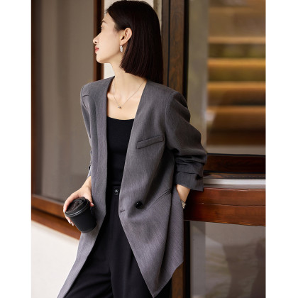 【静奢通勤】春秋时髦无领不对称翻边西装简约藏肉短西服女外套