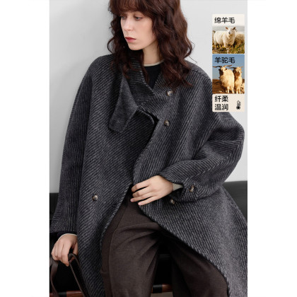 【高知大女主】冬季绵羊毛斜条纹双面呢大衣立领长款女式毛呢外套