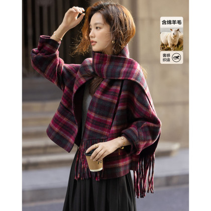 【奢感绵羊毛双面呢】冬季韩风流苏围巾格纹复古小个子藏肉女外套