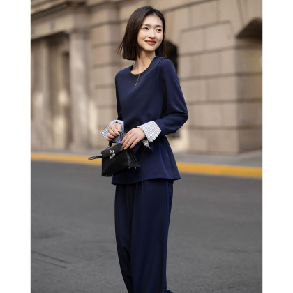 【纸片人】2026春设计感单肩纽扣条纹翻袖口上衣阔腿裤女式两件套