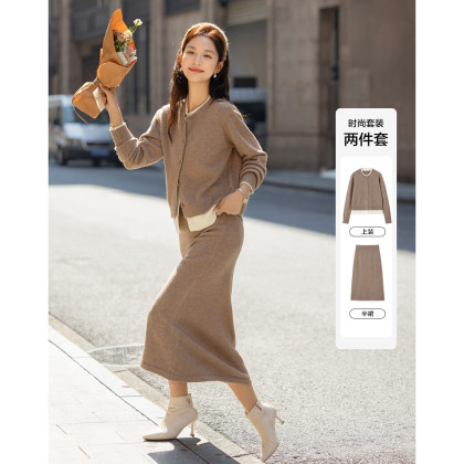 【省心通勤套装】冬季撞色圆领上衣双层门襟松紧腰直筒半裙两件套