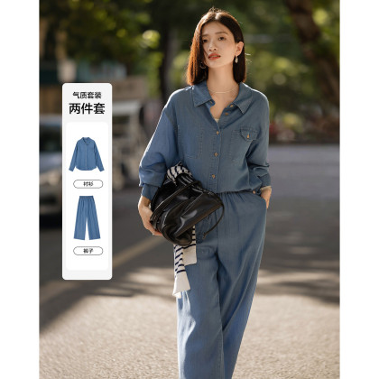 【100莱赛尔套装】2026春不对称口袋压线上衣松紧腰长裤女两件套