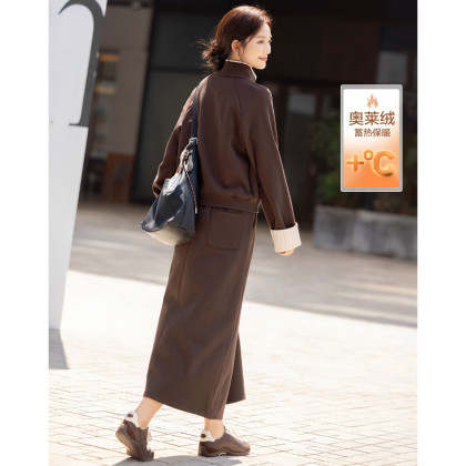 【保暖350G奥莱绒】冬季半开襟拉链上衣拼色条纹半身裙女套装