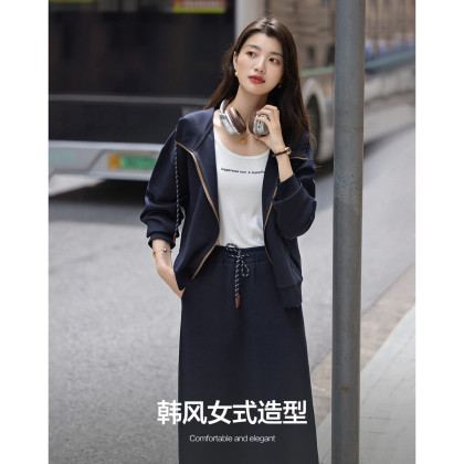 【韩风空气层套装】秋季连帽撞色拉链上衣松紧腰直筒半裙女两件套