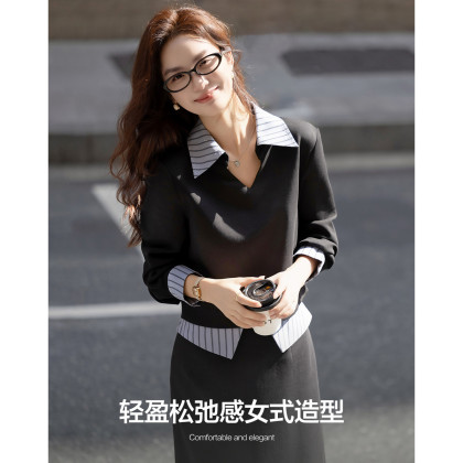 【空气层套装】秋季撞色V字条纹翻领卫衣时髦翻片半身裙女两件套