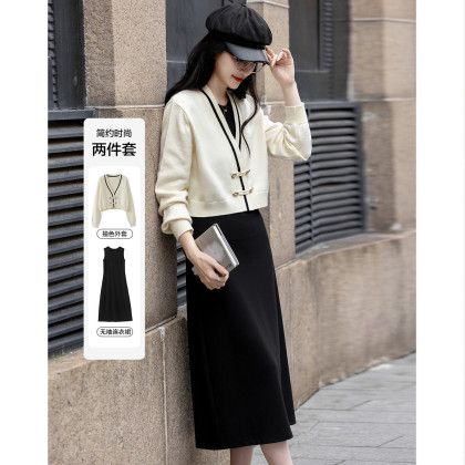 【呼吸感套装】秋简约风四粒扣装饰撞色开衫无袖连衣裙两件套女
