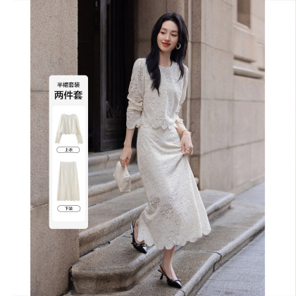 【法式淑女蕾丝套装】秋名媛风通勤圆领短款上衣开叉半身裙两件套