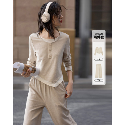 【格雷系套装】春季懒人长袖上衣松紧腰直筒裤遮肉女式针织两件套