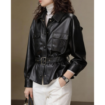 【黑巧贝果】2026春机车风翻领收腰系带光泽感PU大口袋女皮衣外套