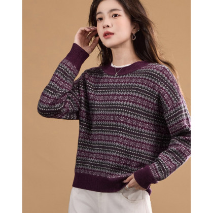 【奢感100绵羊毛】冬季复古提花线衫撞色圆领宽松针织衫女上衣