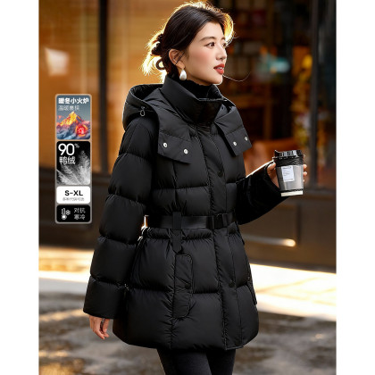 【5A抗菌蓄热】冬季连帽90鸭绒腰带束腰户外中长款女式羽绒服