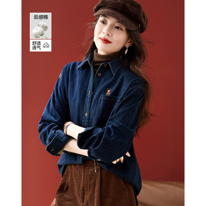 【保暖磨毛云感棉】冬季翻领牛仔衬衫小鹿绣花口袋宽松衬衣女上衣