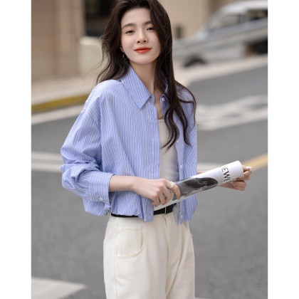 【腰以下都是腿】春季小个子翻领条纹衬衫松紧下摆遮肉衬衣女上衣