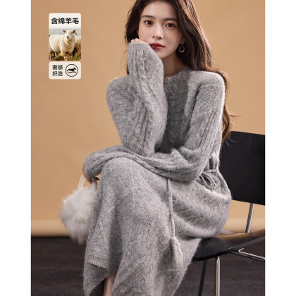 【恋恋暖风】冬季优雅绞花V字圆领流苏腰带含绵羊毛针织女连衣裙