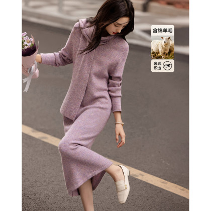 【可脱卸围巾】冬季优雅淡人V领含绵羊毛直筒针织连衣裙女中长款