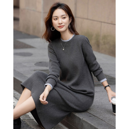 【松弛美学】冬季设计感假两件纤绒纱圆领撞色A字小个子女连衣裙