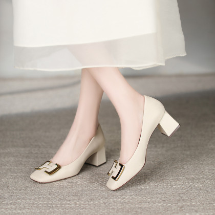 2023春季新款简约通勤方头金属H字母扣单鞋女