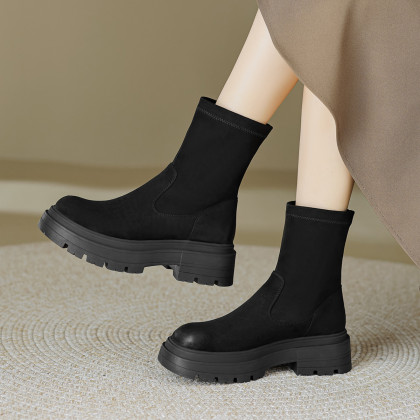 2023秋冬新款时尚简约通勤日常百搭纯色绒面圆头擦色瘦瘦靴