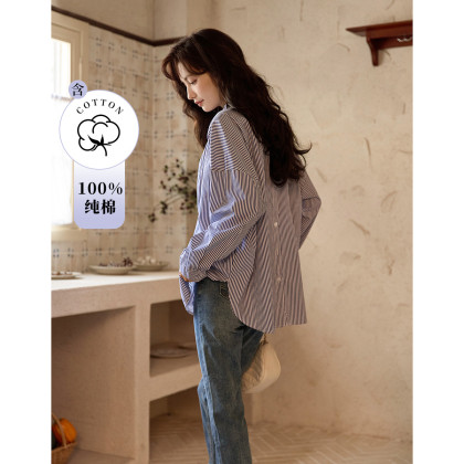 【100%棉复古条纹衬衫】秋装新款落肩袖上衣长袖衬衫女