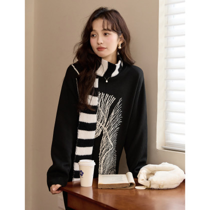 【撞色提花长款针织裙】冬新款圆领宽松气质黑色A字长裙厚连衣裙