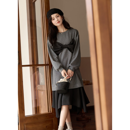 【温柔卫衣裙】温柔甜美不规则裙蝴蝶结装饰堆堆袖减龄连衣裙