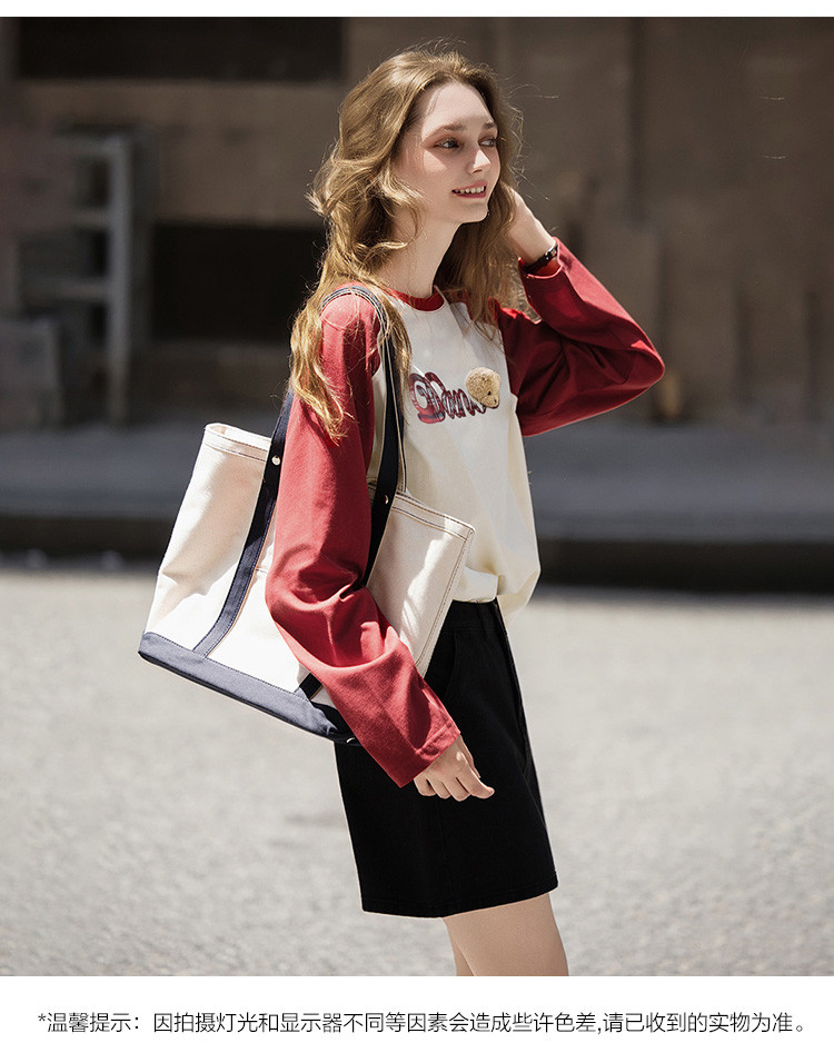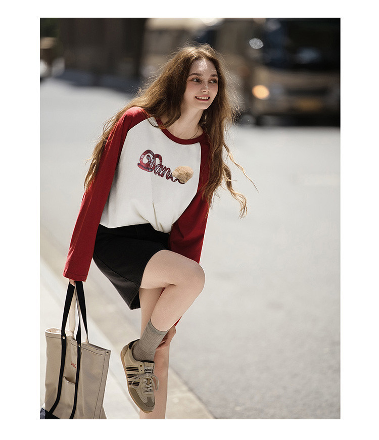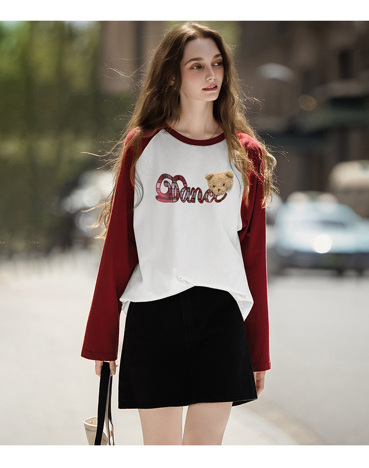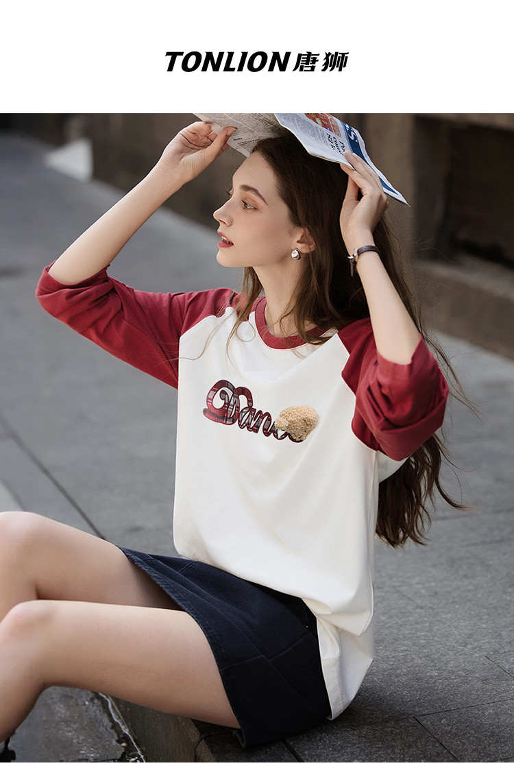 唐狮2026秋季新款长袖T恤女字母撞色插肩袖小熊学生宽松休闲上衣