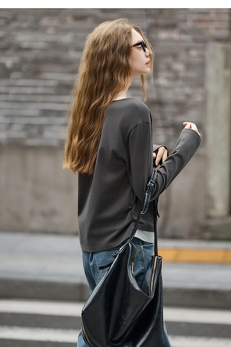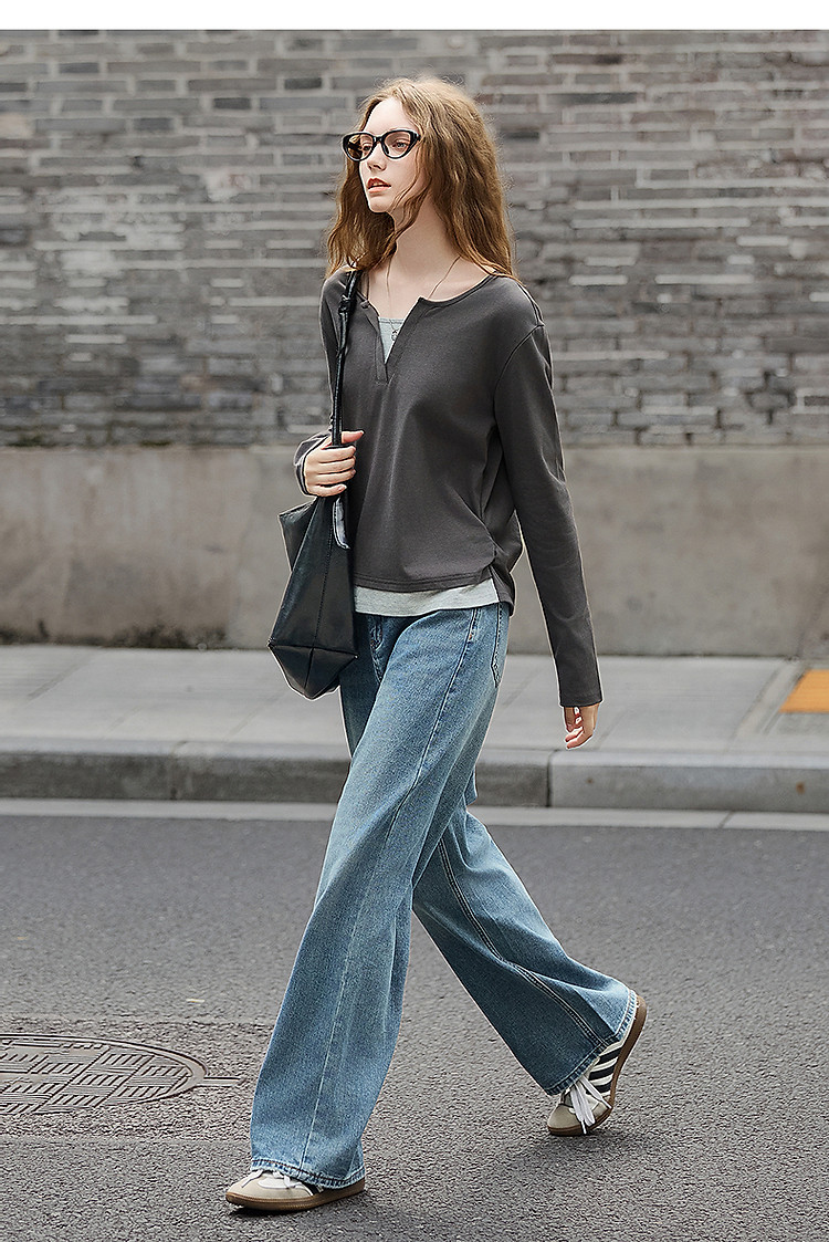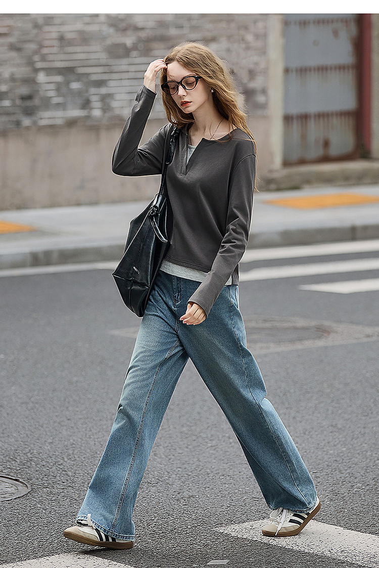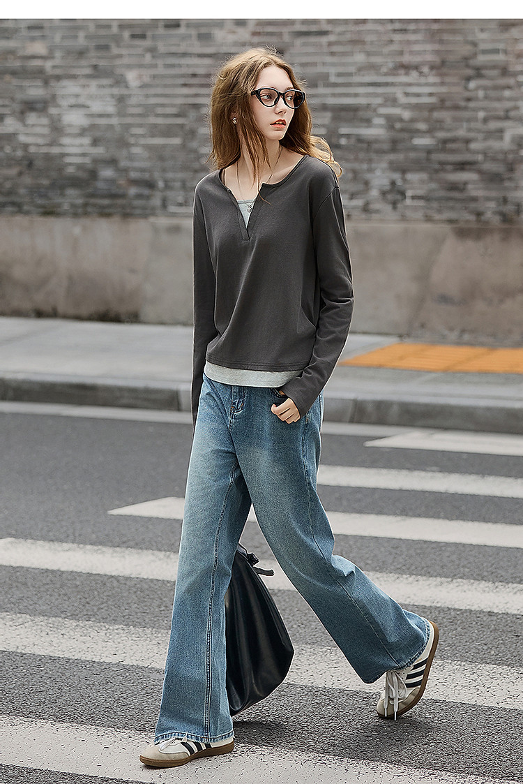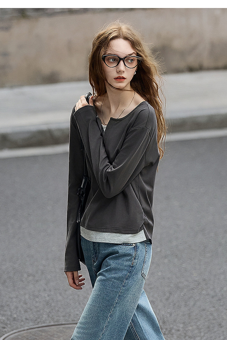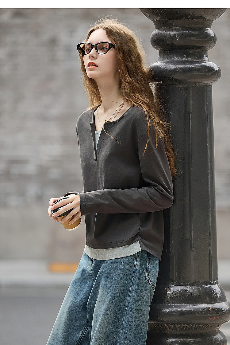 唐狮2026秋季新款长袖T恤女假两件撞色拼接半开领百搭气质上衣