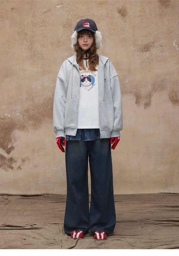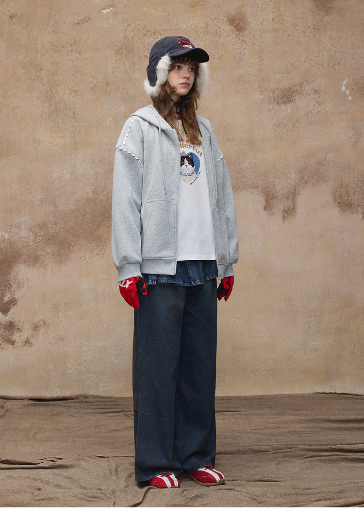 唐狮2026秋季新款针织外套女印花连帽灰色韩系慵懒风休闲开衫外套