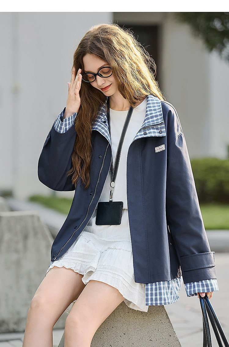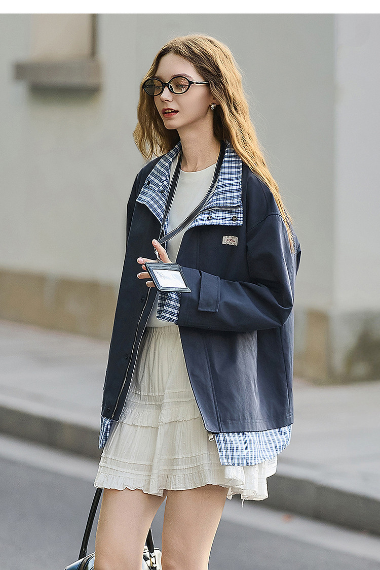 唐狮2026秋季新款工装外套女撞色拼接假两件美式复古翻领开衫夹克