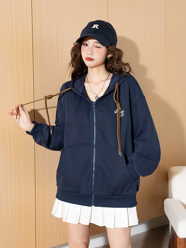 唐狮2025秋季开衫外套女士连帽字母印花藏青短款外套宽松休闲风
